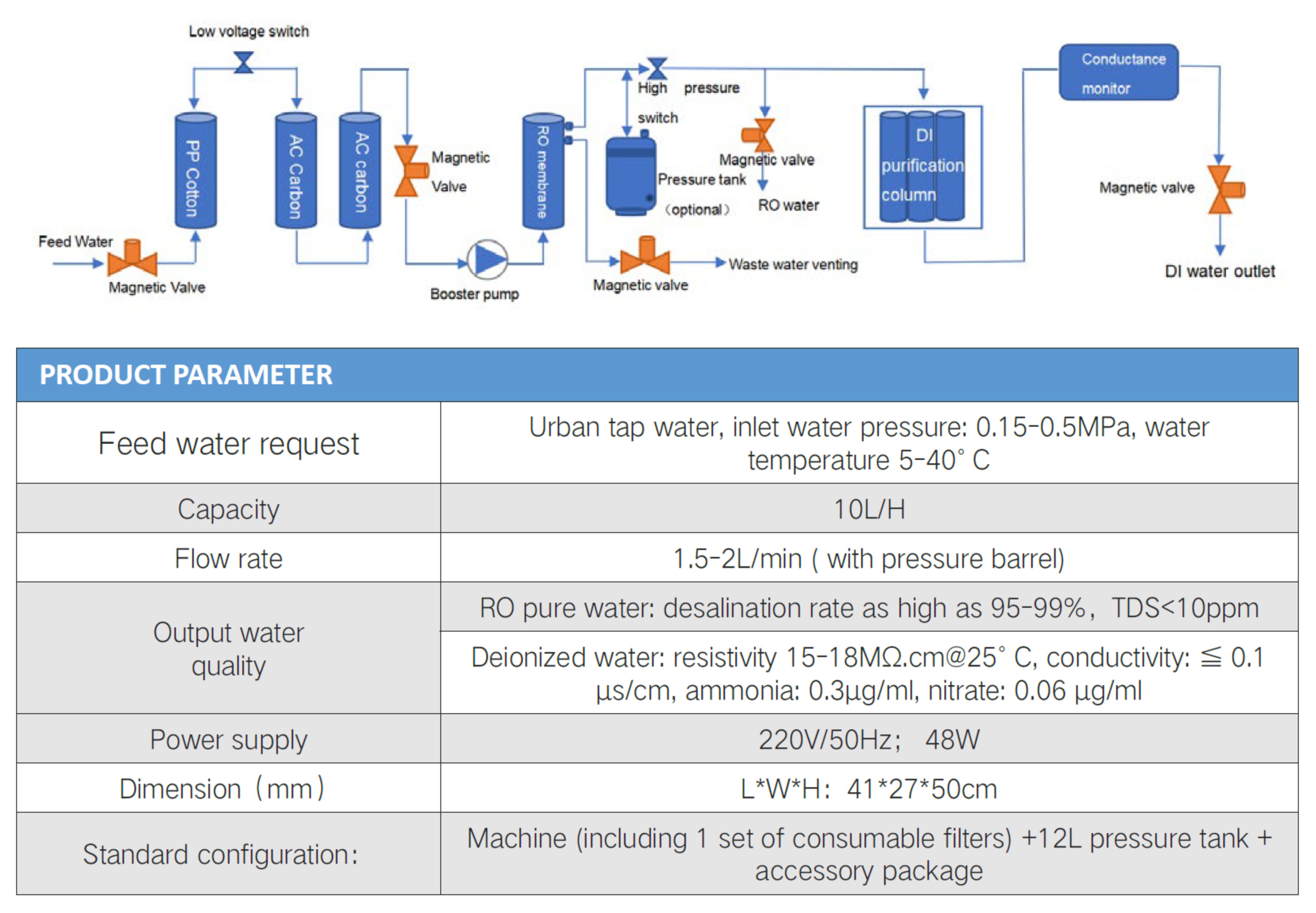 The fifth stage: Deionization purification column: remove most of the heavy metals and trace elements in the water,and the water quality meets the national laboratory water first grade water standred.