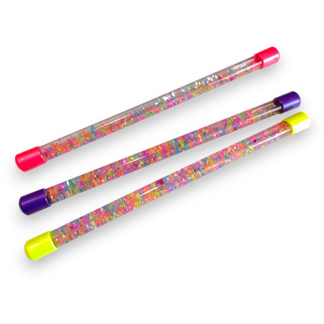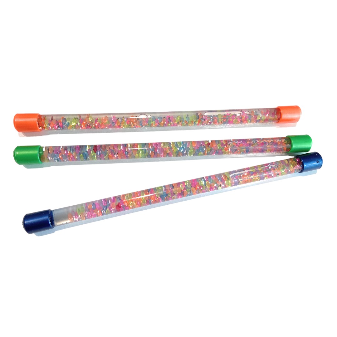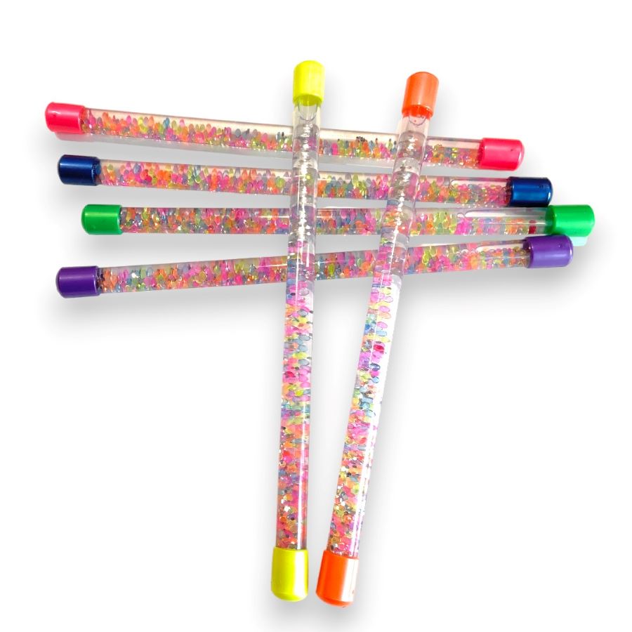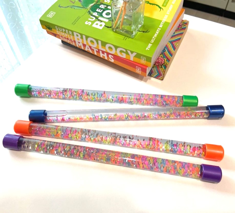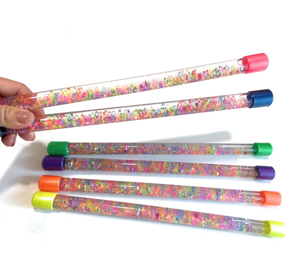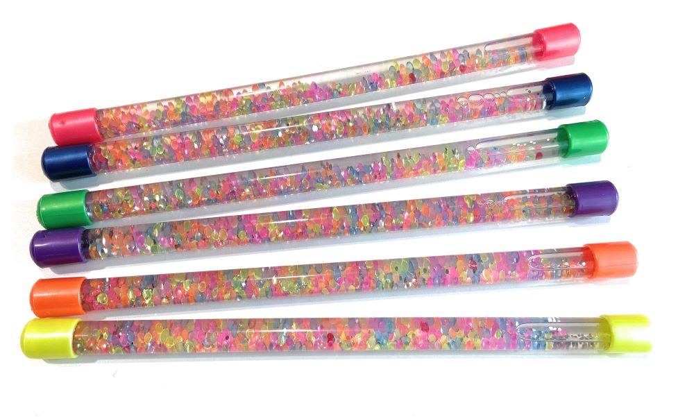 pvc tube, colored caps, colored beads, glitter confetti, water