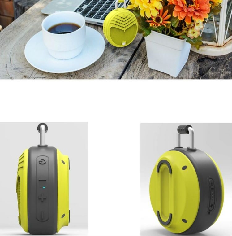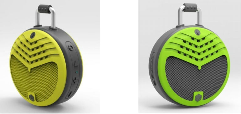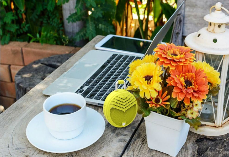 This Bluetooth speaker comes in a compact round shape and has a clasp on top for attachment. It delivers crisp and clear sounds and offers simple buttoned controls. Flaunting a durable waterproof construction, this Bluetooth speaker is perfect for playing music outdoors.