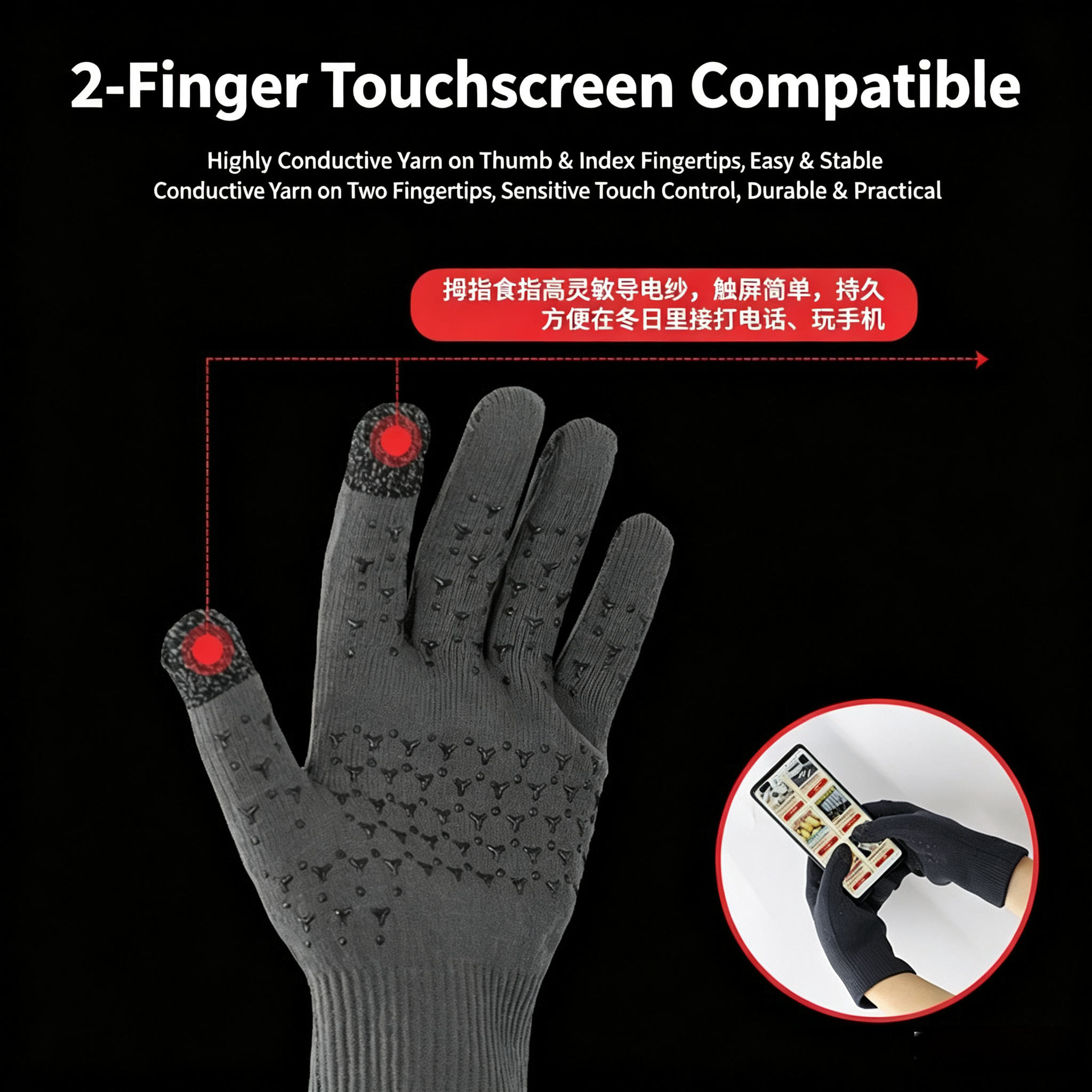 3. 2-Finger Sensitive Touchscreen Design: Conductive yarn on thumb and index fingertips enables seamless, responsive phone operation without removing gloves, perfect for taking calls, navigating, or checking messages outdoors.