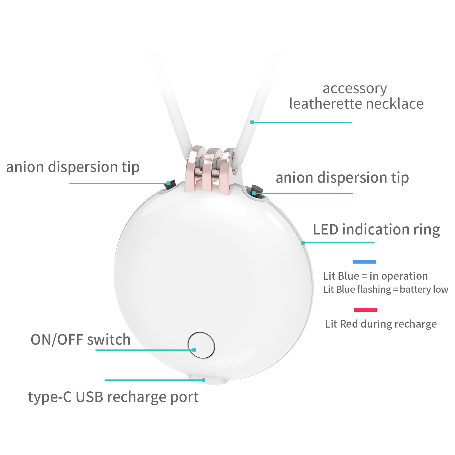 Package Type: 1 Ionizer main unit 1 Accessory necklace 1 type-C recharge cord 1 user manual (English) *customized packaging is welcome with 1K quantity.