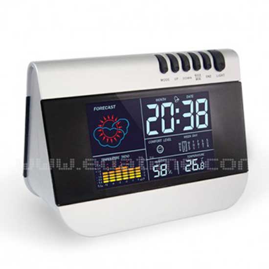 This weather station clock is designed with style and functionality in mind. The large color display shows date, time, temperature, humidity, and weather forecast in great clarity. The stylish modern clock is an ideal addition to your home or office.