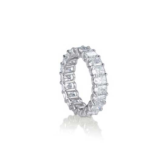This wedding ring features 22 radiant-cut sparkling diamonds to symbolize eternity. The delicate handmade platinum setting reveals the brilliance and the perfect cut of the stones. This gorgeous ring will leave an unforgettable mark for the love of couples.