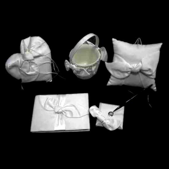 Presented here is a collection of wedding items in an ivory color for a pure and neat style. The collection offers a wedding album, a heart-shaped cushion, a sofa cushion, a basket and other related items. This set is great for the wedding venues or studios.