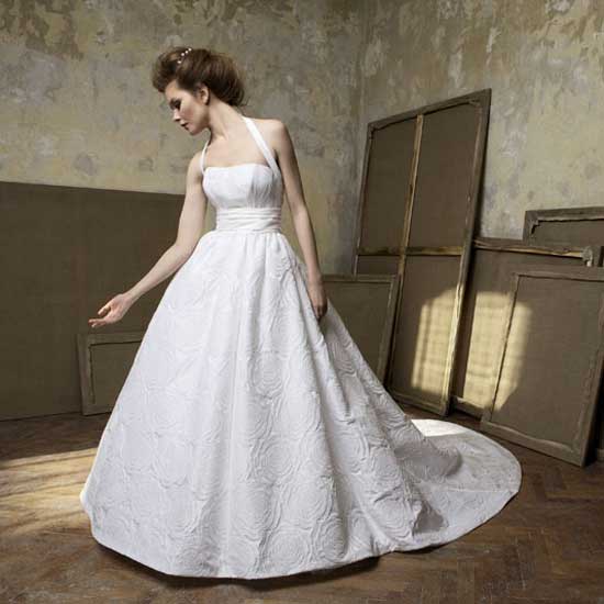 This is a sumptuous dress in white mat and satin jacquard with a relief of roses in bloom. The bust with straight décolleté is embellished with sundress straps in draped taffeta. Series of hollow pleats gather for the volume skirt and with a majestic train. The waist is divinely highlighted by a wide draped taffeta belt.