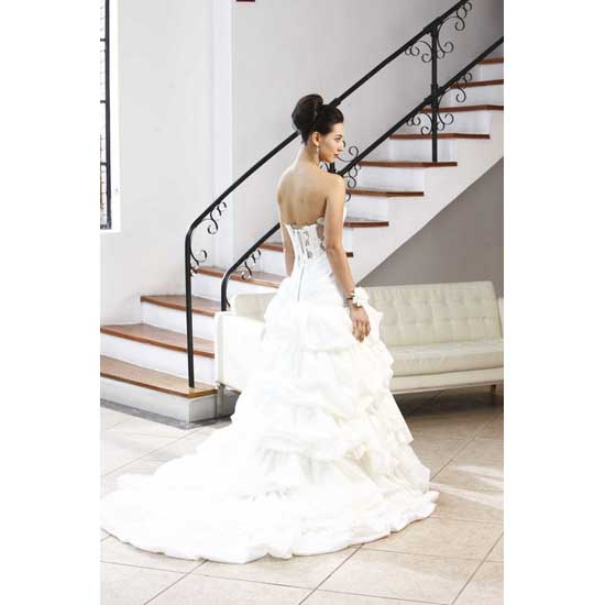 The wedding dress features a sleeveless design with two bead-accented shoulder straps. The lower part of the dress showcases layered construction for an elegant touch. This wedding dress will surely make the bride look gorgeous on her big day.
