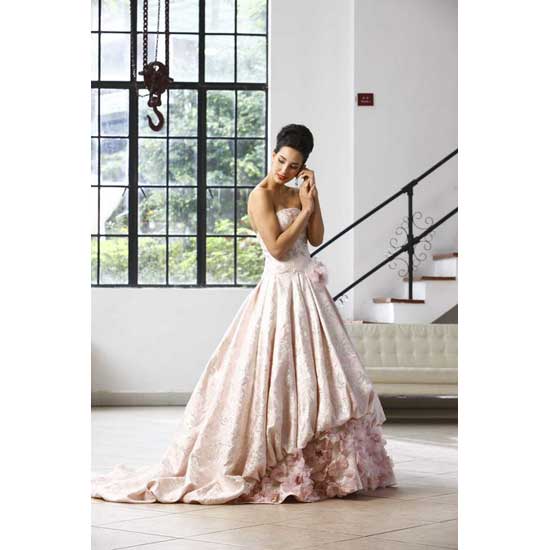 Featured is a wedding dress with a round neckline and a rosette on the lower part of the bodice. The pleated detailing and floral rosettes on the lower part of the dress add a touch of decoration. This wedding dress in unconventional rosy color is a unique choice for brides.