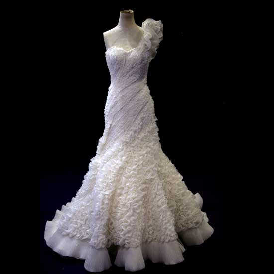 This wedding dress in the spotlight comes with an off-shoulder design. The Grecian-inspired wedding dress features a volume bottom which further highlights the curve-hugging bodice. An eye-catching flower on the shoulder gives this gown a romantic touch.
