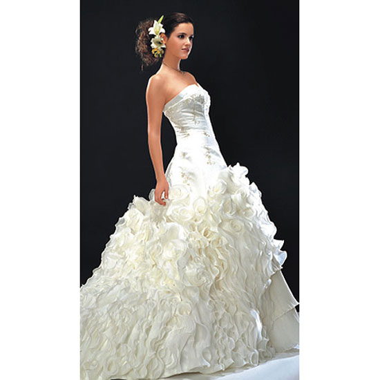 The fitted bodice of this bridal gown transforms into a soft cloud of cascading layers of rose-like ruffles that pump up the volume. The bandeau bodice gives way to your well-selected jewelry pieces. The ivory white hue brings out your inner angelic character on the big day.