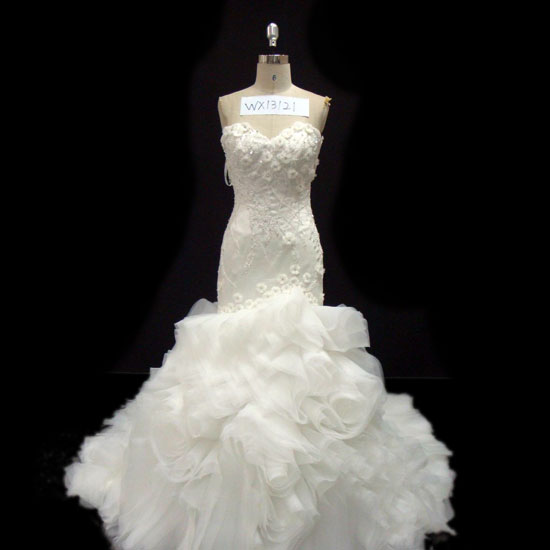 This is a bridal gown that is finely tailored to fit ladies' figures perfectly. The top bodice is adorned with shimmering beads and a romantic sweetheart neckline. This wedding gown features a graceful fluffy skirt for a touch of elegance.