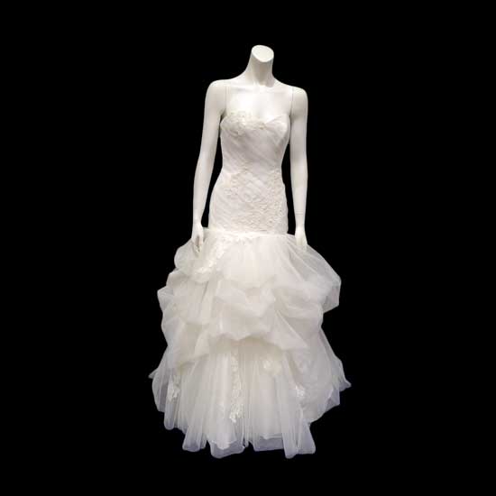 This mermaid dress is beautifully decorated with appliques of beads and laces. The layers of tulles add an elegant style to the dress. This flattering trumpet gown perfectly shows your body curves and makes you look splendid on your wedding day.