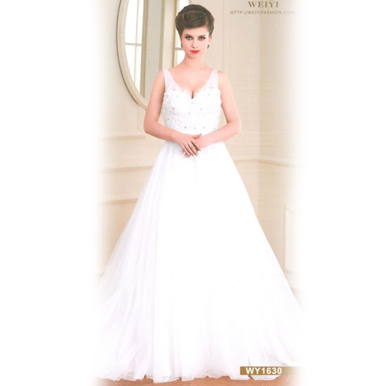 This is a wedding dress that is made of quality material for a natural texture. It is designed with an elegant heart neckline and a puffy pleated skirt. The shiny beaded details add a touch of style to the whole piece.