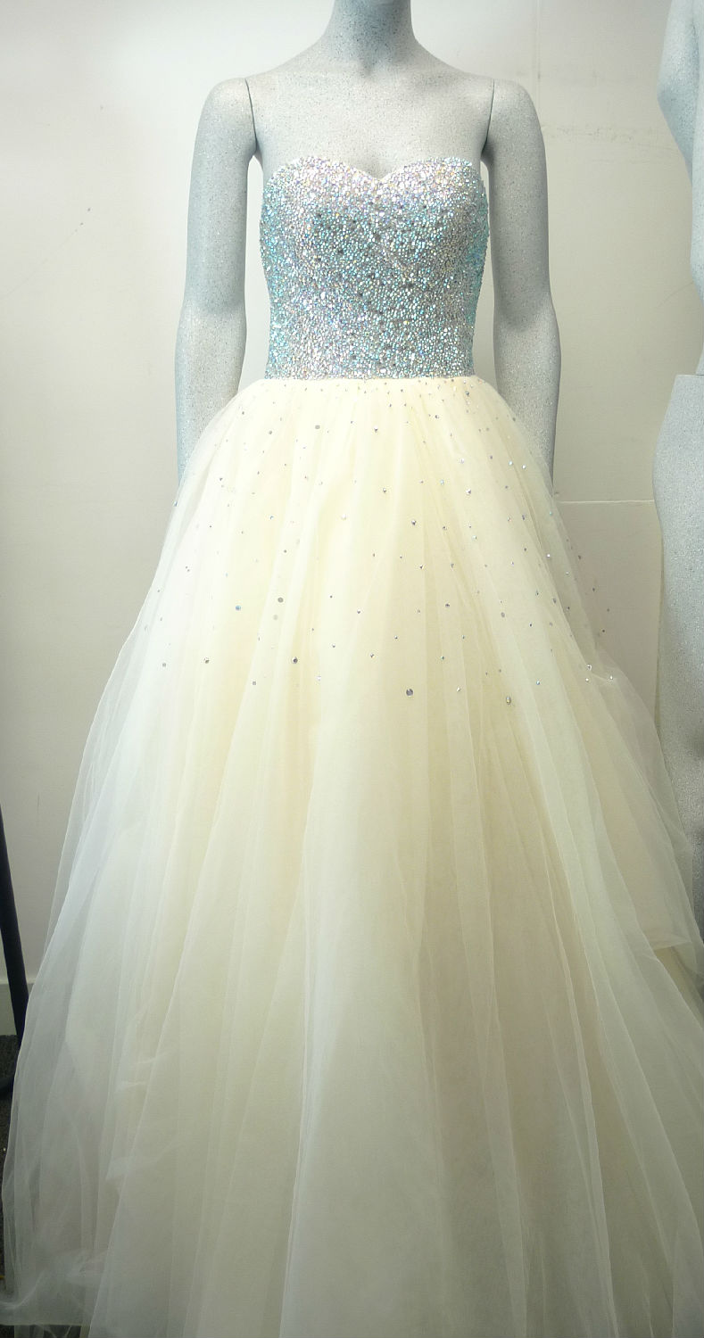 Shine to the max in the biggest day of your life with this glamorous wedding dress. The glittering slim-fit bodice and the classic sweetheart neckline accent your alluring physique. The voluminous tulle skirt cascades down to the floor, which literally turns you into the luckiest princess in the world.