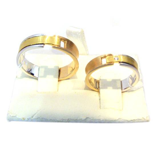 This is a pair of wedding rings. It is made of 18K yellow and white gold. Diamonds are mounted in bead setting. The simple design brings out elegance and commitment to the marriage.