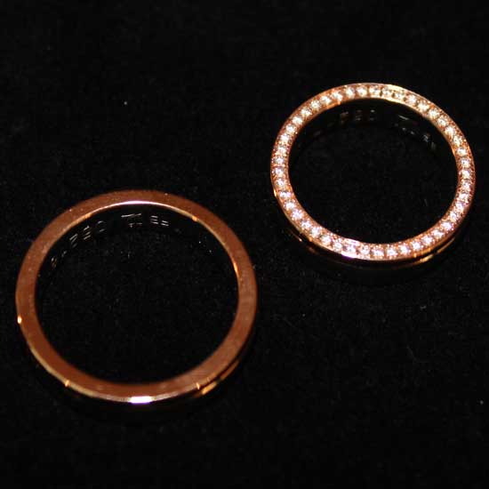 Here is a beautiful pair of wedding rings coming in a simple band style. The gold band is finely polished to showcase an elegant style. The ladies’ ring is adorned with diamonds to give out dazzling sparkles.