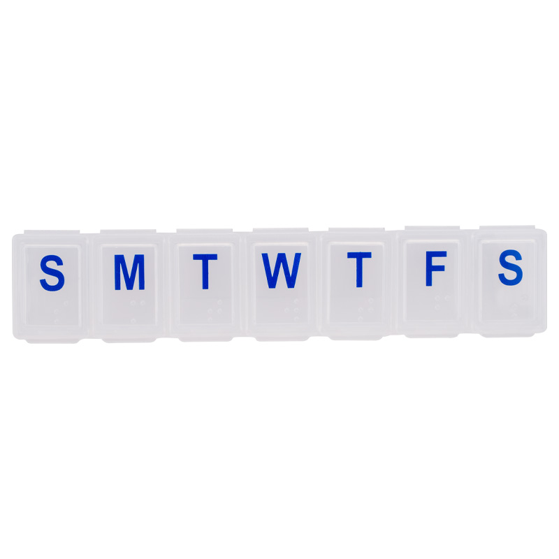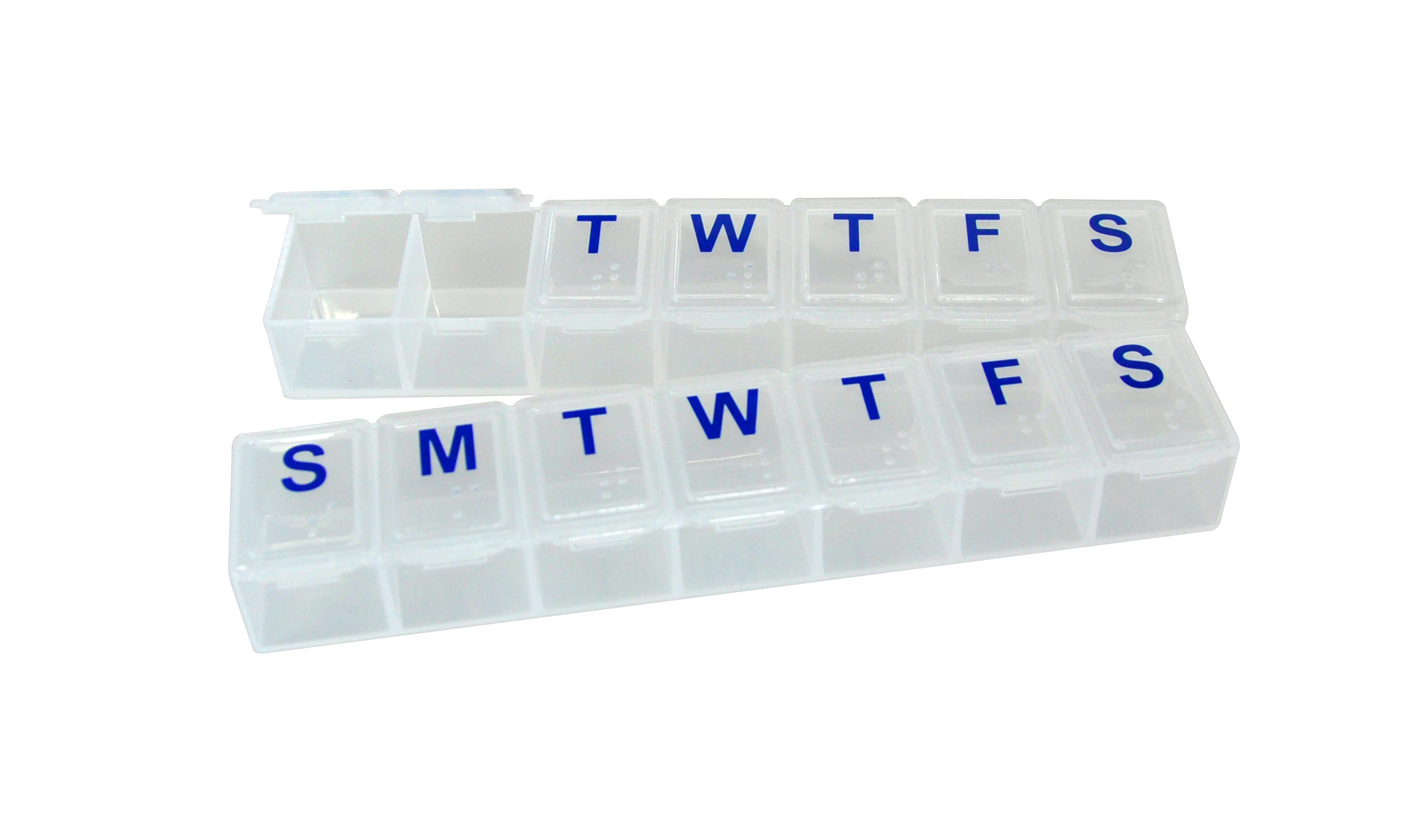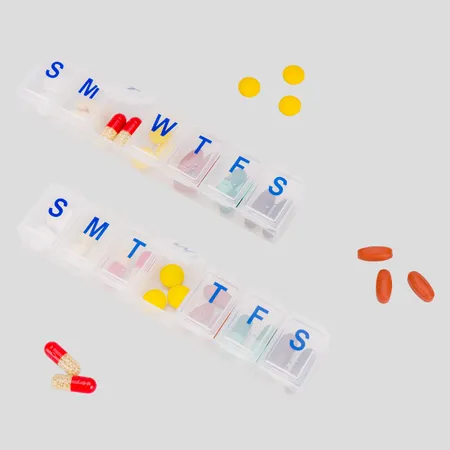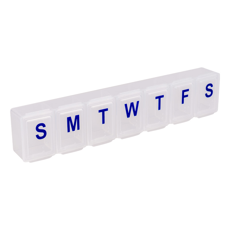 7-day pill box is made of PP. Medicine users can accurately divide medicines according to doctor's orders for each week's day. lt is convenient for the user to put the medicine to be eaten into the medicine compartment according to the dose for storage, so that it can be carried and taken on time. Store in a dry, ventilated place away from heat sources. Do not mix with chemicals or direct sunlight.