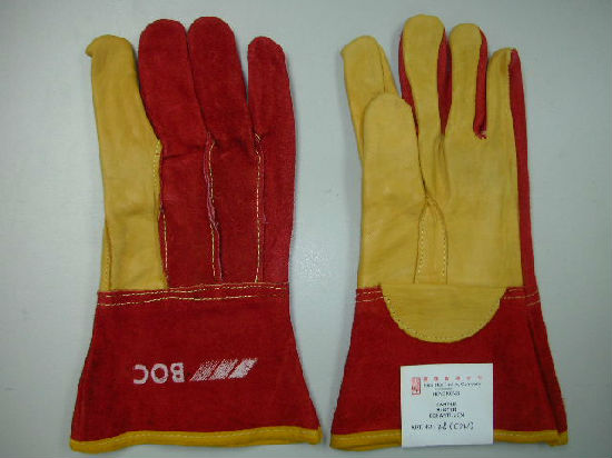 • Red cow split leather TIG glove with yellow cow grain leather palm, thumb, index finger, pulse guard, clued cut style, Kevlar stitching, unlined.
