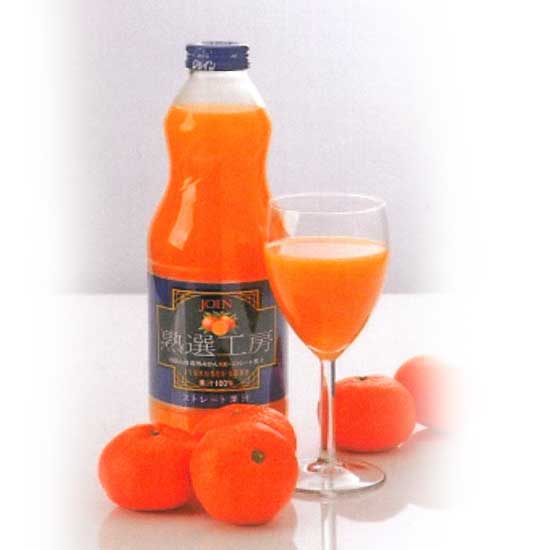 Displayed is a bottle of Wenzhou mandarin juice made of high quality ingredients. Carefully selected, the ripe mandarins are then professionally squeezed and processed to produce juice. This juice is 100% pure for your enjoyment.