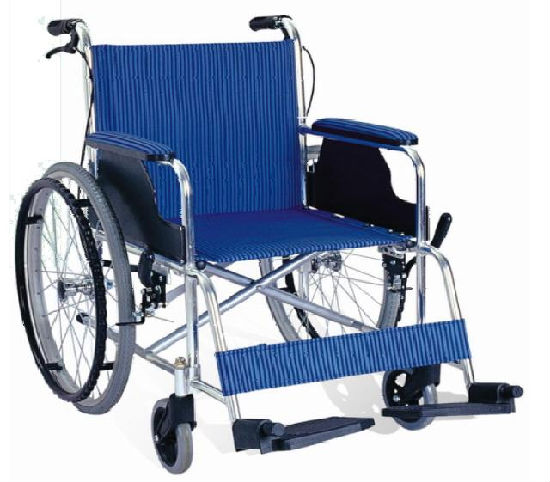 Made of aluminum, this wheelchair is made to last. It can either be propelled by an attendant through the push handles or by the occupant using the handrims attached to the rear wheels. Both the handle brakes and the 2 attendant-applied lever hand brakes are available to ensure safety, while the whole wheelchair, with its fixed armrests and footrests, can be folded for easy storage. Blue streaks decorate the seat and armrests to give a refined touch to the chair.