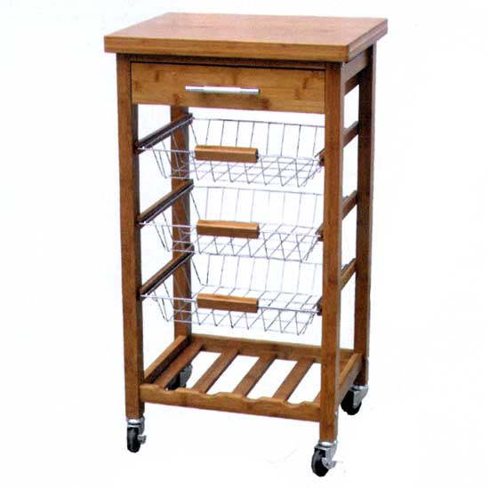 This multi-tier rack is constructed of bamboo. It comes with 3 wire baskets and a drawer. The flat top allows you to put various cookware such as stock pots, casseroles, frying pans, etc.