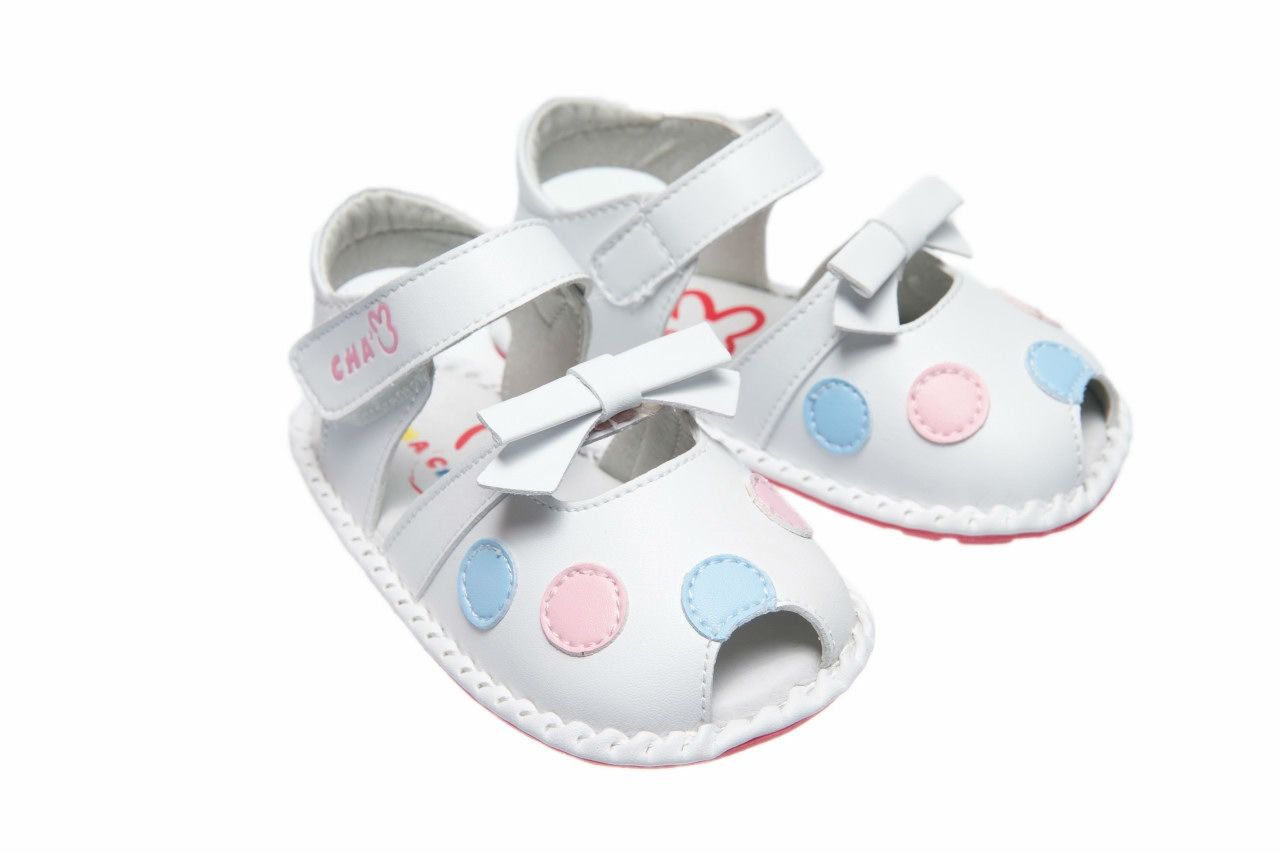 Complete your baby’s wardrobe with this pair of charming sandals. These shoes are designed in pale tone, coming with adorable 3D bow-knots and dot appliques. The slip resistant soles allow active motions with secured comfort. Pair them with your baby’s favorite dress.