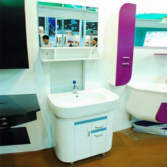 This basin with a cabinet boasts a cute and modern look. The cabinet, basin and shelves with round edges and angles look lovely with the frame-less mirror as a refined touch. This basin is perfect for a modern bathroom setting.