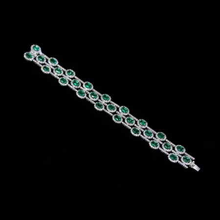 This is a white gold bracelet that comes with a high-gloss surface. It is accented with shimmering diamonds and emeralds for a touch of luxuriousness. This elegant bracelet pairs with your outfit nicely.