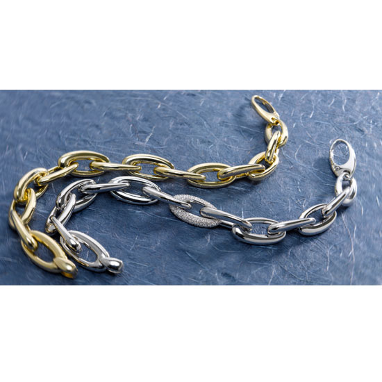 This white gold bracelet features a bold design in the shape of chains. The minimalist style is clean and urban. Subtle decorative detail in diamond lends glamour to this jewelry.
