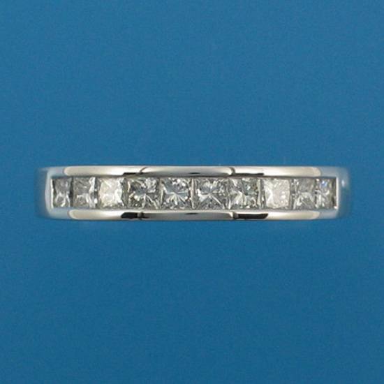 This diamond ring has princess cut diamonds in full eternity channel setting. The shank with bright polish finish advances the sparkling effect with the glittering diamonds. It will be a nice choice of engagement ring with its simple but elegant design.