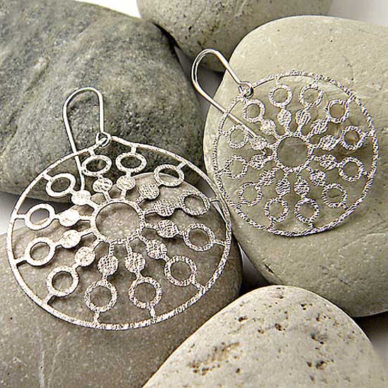 These vintage white gold earrings are designed with large, round pendants with cutout patterns. The surfaces of the earrings have gone through special treatment for added shine. They are ideal accessories for any casual wear.
