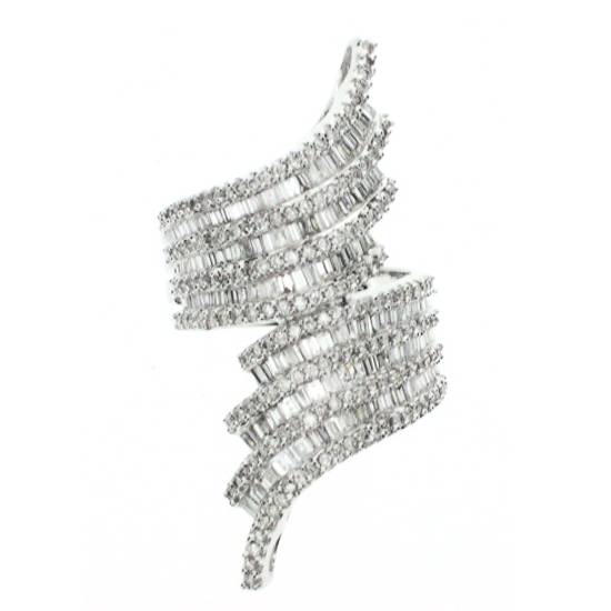 This is an elongated diamond ring made with 18K white gold. The diamond ring features a swirling design that the diamond arranged in each "line" that swirls down in the helix shape. The four major curves are bead set with round brilliant diamonds while the gap is filled with bagette diamonds.