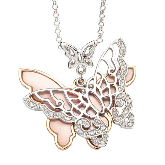 Highlighted is a white gold necklace with a butterfly-theme design that is aesthetically appealing. The butterfly on the front features a hollow-cut structure and is well adorned with diamonds. This ornamental necklace is a great idea to enhance your party dress.