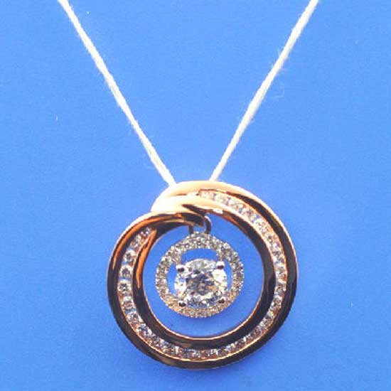 The displayed white gold pendant features a round shape with a cutout design in the middle. It is ornamented with a big stone in the center and shiny small stones. This delicate pendant completes your necklace designs easily.
