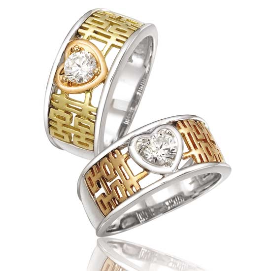 Outlined is a white gold ring with a round-shape diamond decoration on a heart-shape prong. The hollow-cut structure is constructed by a Chinese character, which represents happiness and celebration. This ornamental white gold ring is a great gift idea for married couples.