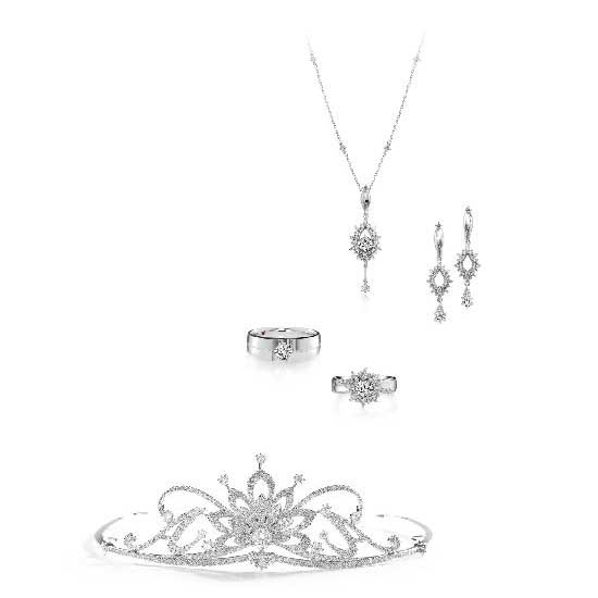 This is wedding jewelry collection set comes with a pair of earrings, a necklace, a finger, a crown, etc. Crafted of 14K or 18K white gold, each jewelry piece is finely crafted with exquisite details and shimmers with a highly glossy finish. This well-matched jewelry set is an ideal collection for your special wedding.