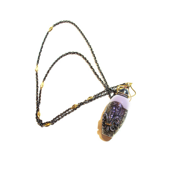 This necklace features an exquisite silver pendant with dainty engraved details. The white onyx on the top is carefully made for an extra dose of stylishness. This necklace can be matched with silver, gold or metal necklaces.
