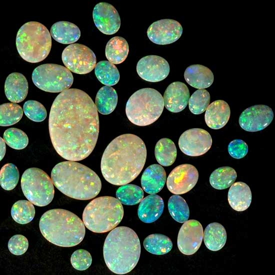 This collection of white opal stones comes in different shapes, presenting a splendid play of mixed colors. The surface of each opal is subtly brushed for high smoothness and excellent luster. Flashing with color variations, the polished opal is an entertaining gemstone to possess.