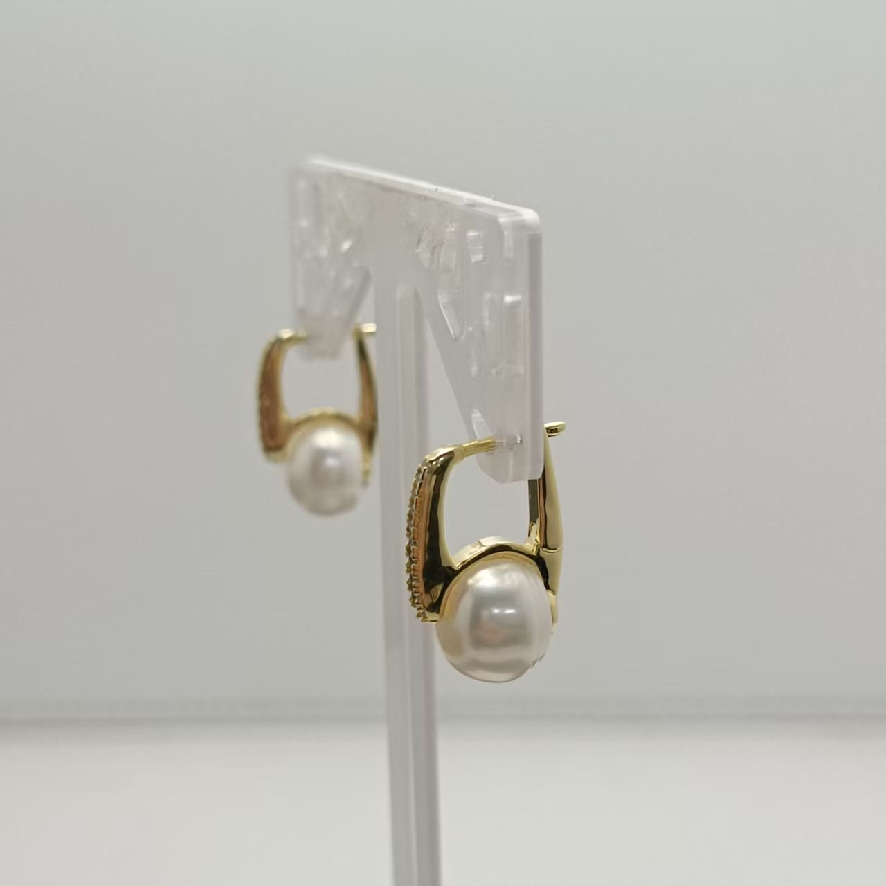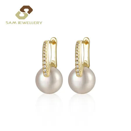 White Round Shell Pearl Earrings With Pave CZ Accent Hoops Elegant Gold-Plated Pearl Drop Earrings for Women