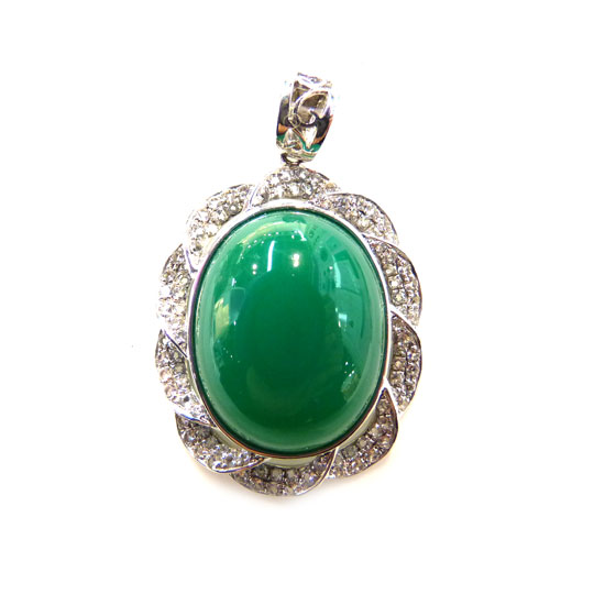 This pendant features a large oval-cut green gem as its center stone. It is encircled by white topaz stones for extraordinary charm. Let this stunning pendant grace your neck.