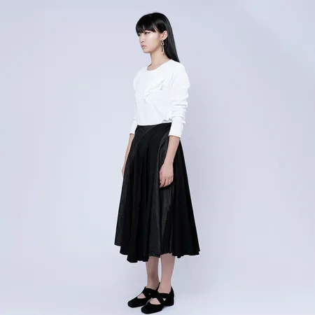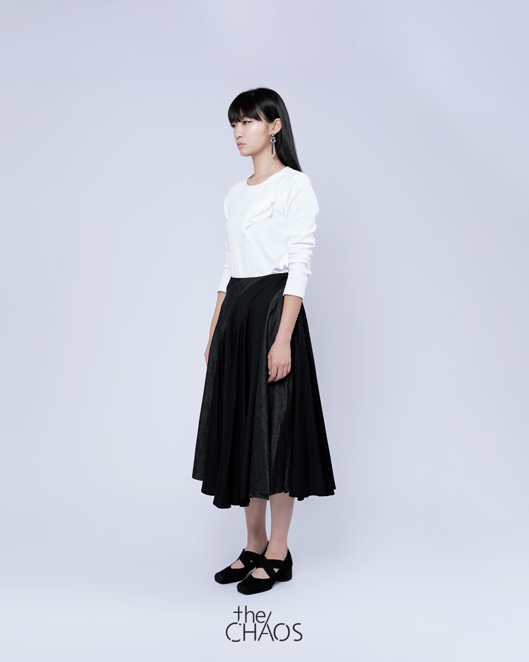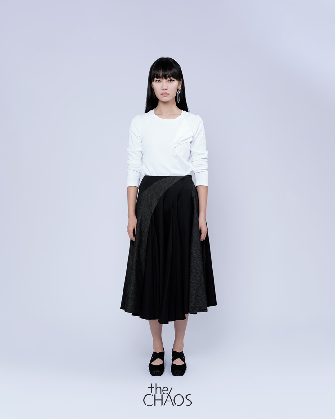 The White Upcycled 3D Flow Sculpture Tee in cotton jersey , upcycled from a deadstock tee is one of a kind. Styling with the 'Fluidity At Rest' Inpired Fabric Combo Flare Twist Skirt.