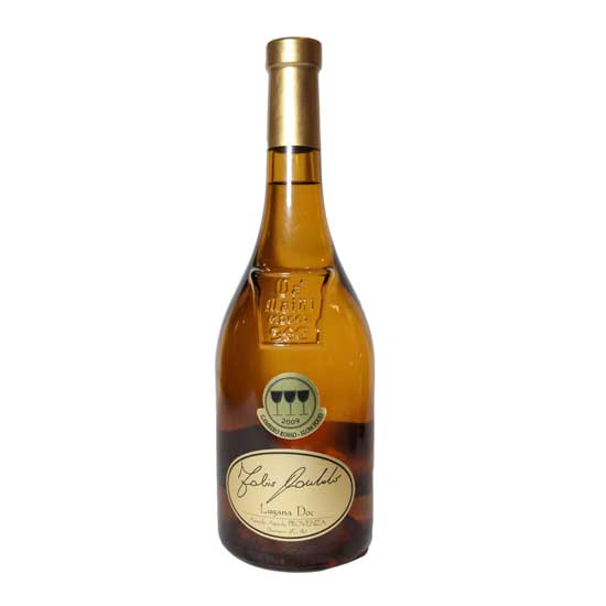 Featured here is a bottle of medium-dry white wine made from Trebbiano di Lugana grapes grown in Lombardy, Italy. It exhibits a bright golden hue with an intense and aromatic fragrance. This award-winning white wine is perfect with light snacks and cheese.