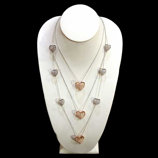 The beautiful necklace here boasts a stylish multi-row style. The slim chain is embellished with heart-shaped adornments, which are set in rose gold and white gold. Every heart feature cutout patterns to display brilliant craftsmanship.