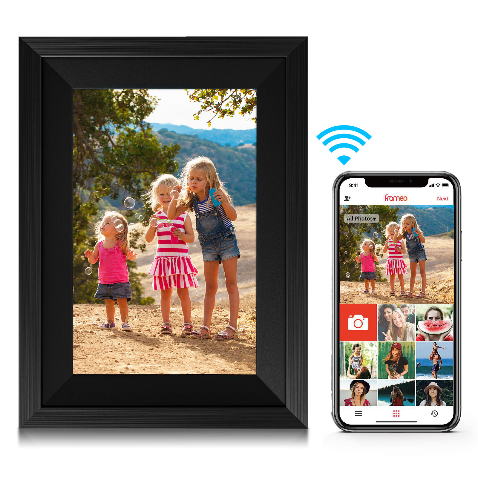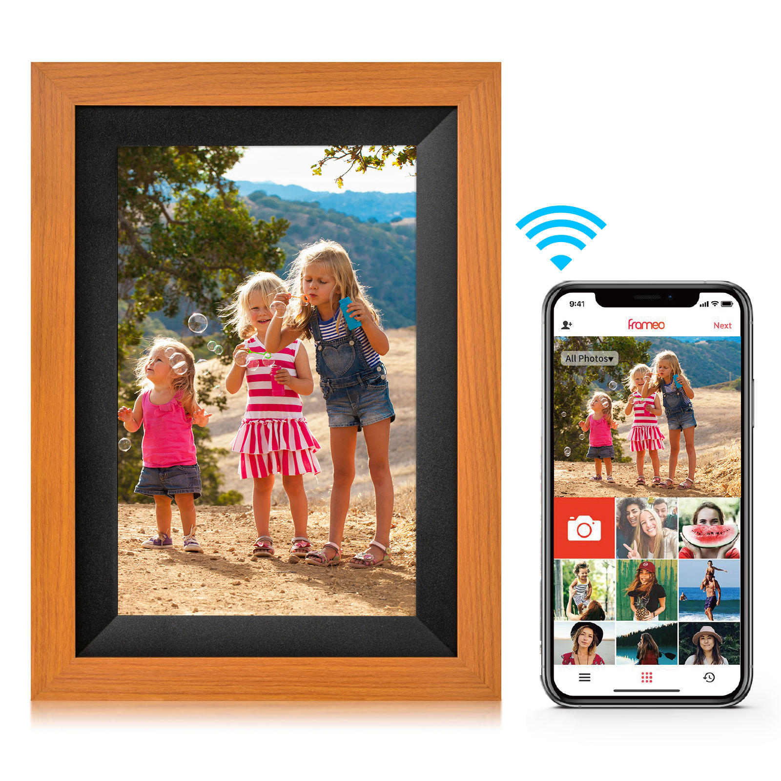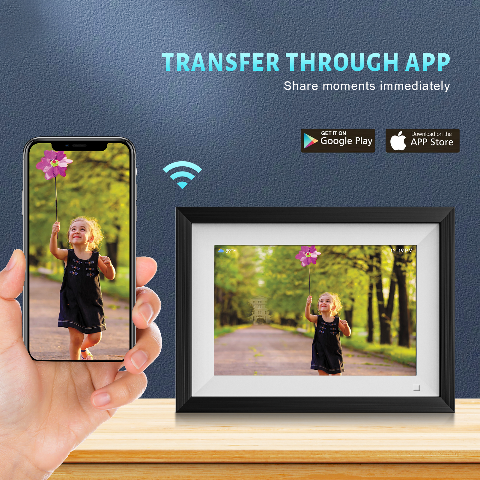 1. Connect with phone APP via WiFi, can transmit videos and images from the phone to the digital photo frame for display;