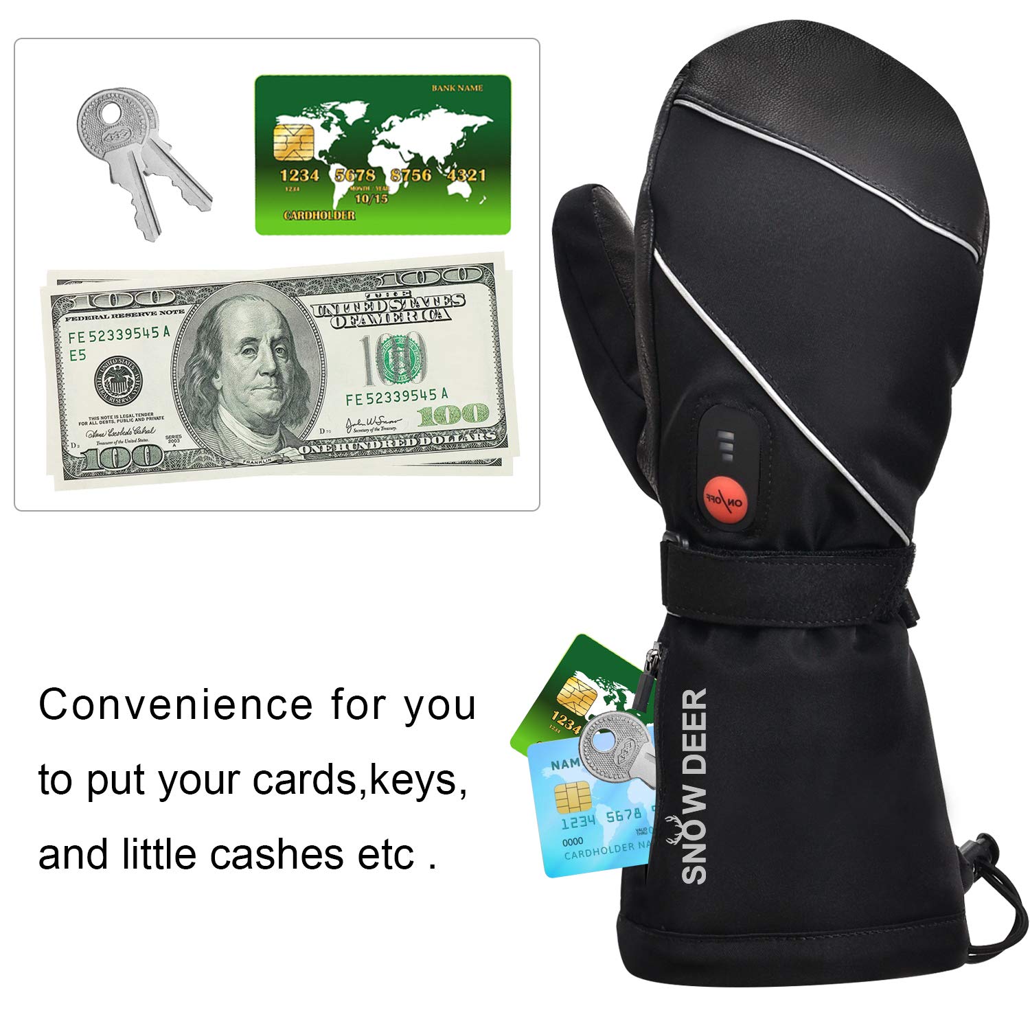 Waterproof, windproof, non-slip, touch screen, Adjustable elastic band, Waterproof zipper, Battery pocket