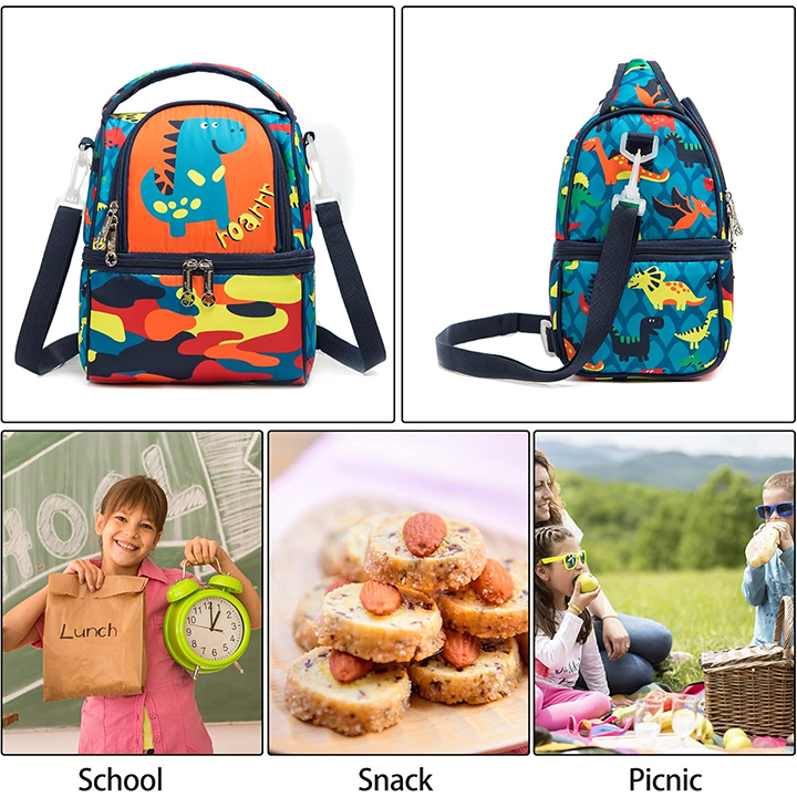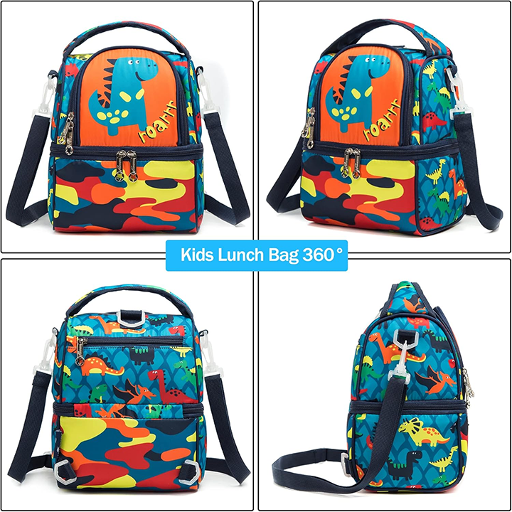 2. Fun and practical kids lunch bag: vibrant dinosaur pattern that kids love, two separate compartments for organized storage, waterproof lining to prevent leaks, durable construction to withstand daily use, and comfortable to carry with its ergonomic design.