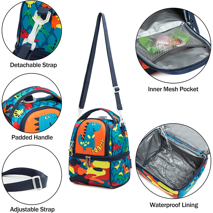 1. Colorful and charming kids lunch backpack featuring a delightful dinosaur design, excellent insulation to keep food fresh, spacious compartments for various foods, an adjustable strap for a perfect fit, and easy-to-clean material for hassle-free maintenance.