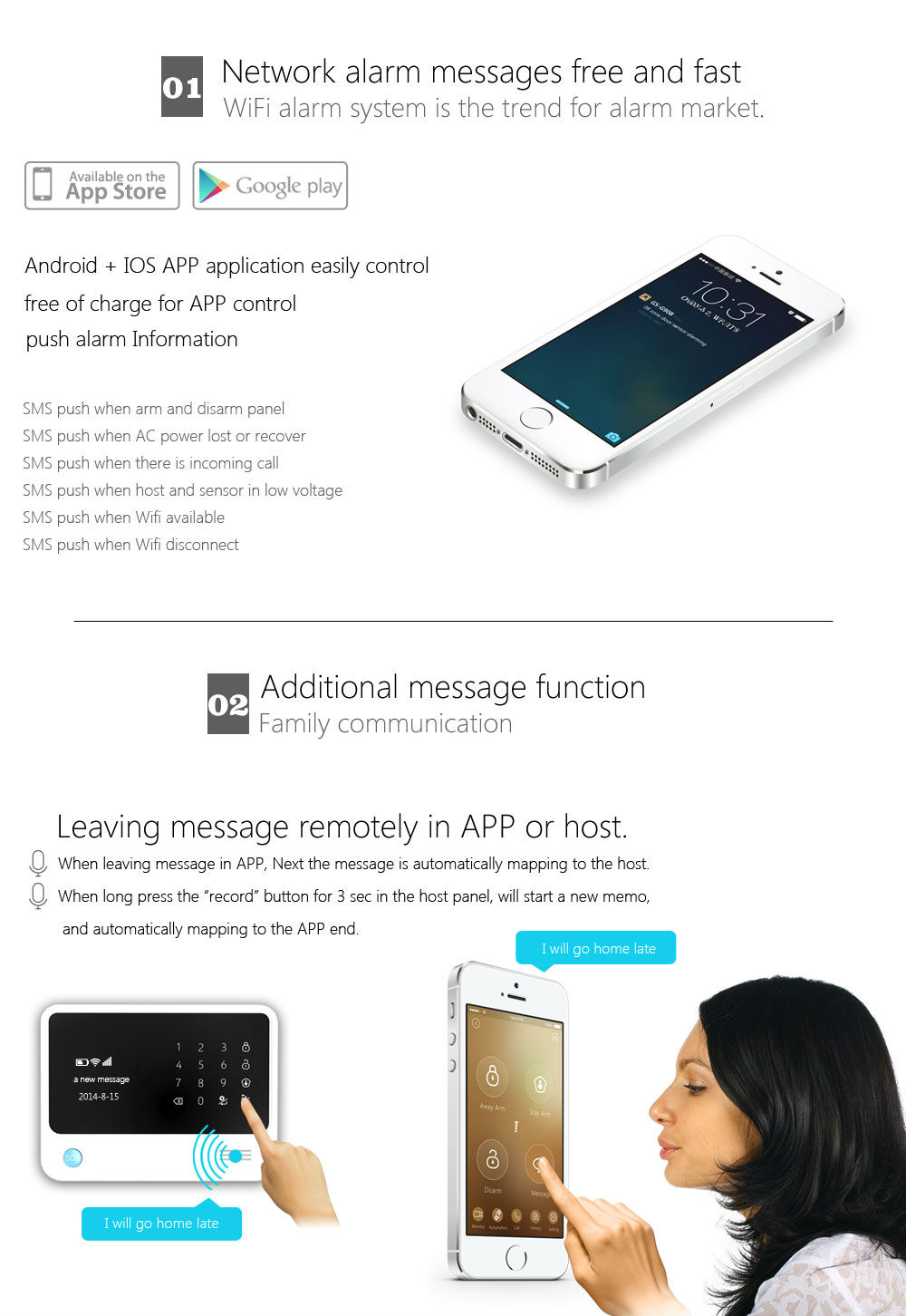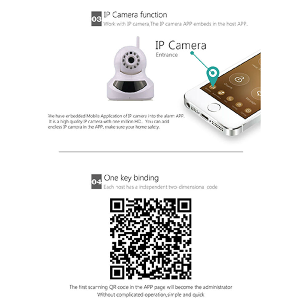 3.Free charges through WiFi network. When there is no WIFI, the host will work with 3G network. If there is neither WiFi nor 3G network ,then the alarm host will send alarm SMS and make alarm call. 4.Work with IP camera, The IP camera APP embeds in the host APP.