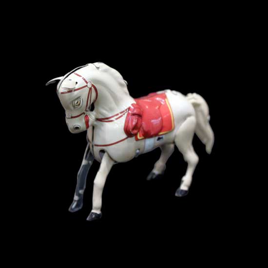 This wind-up toy features a white circus horse design for attractiveness. The toy horse with a red saddle is looking down to its front hooves. This sophisticated wind-up toy horse is a collectible item.