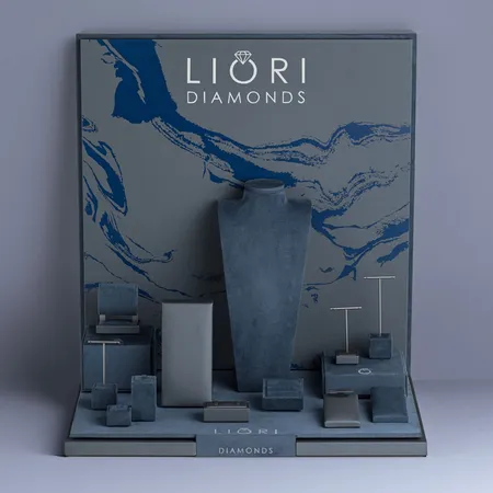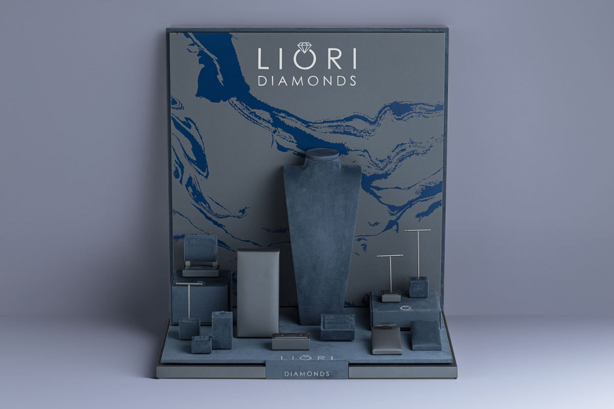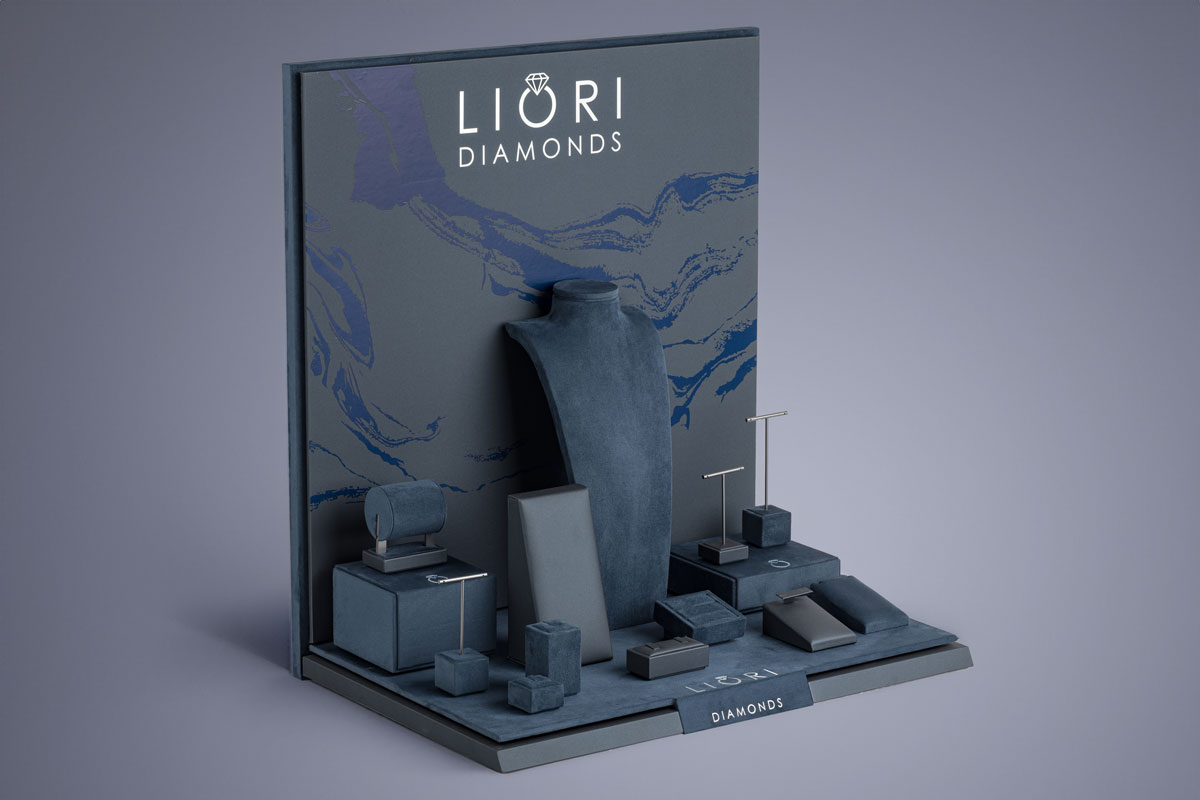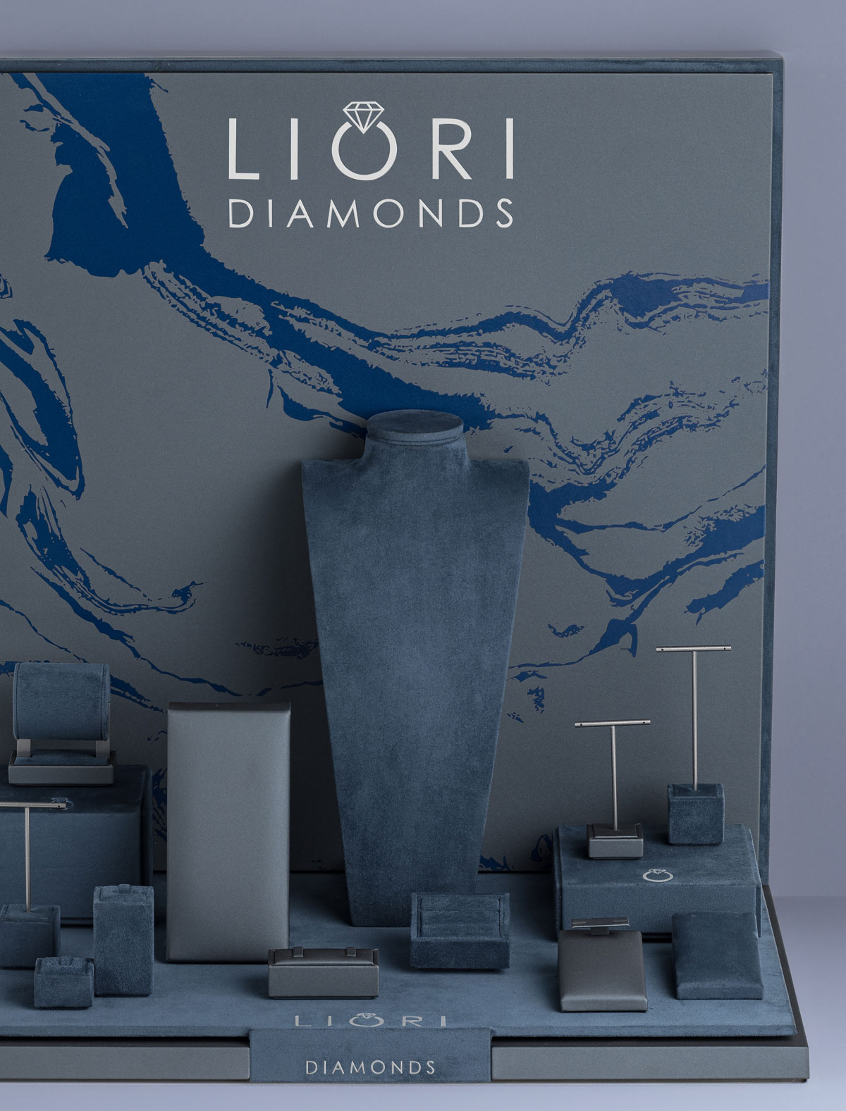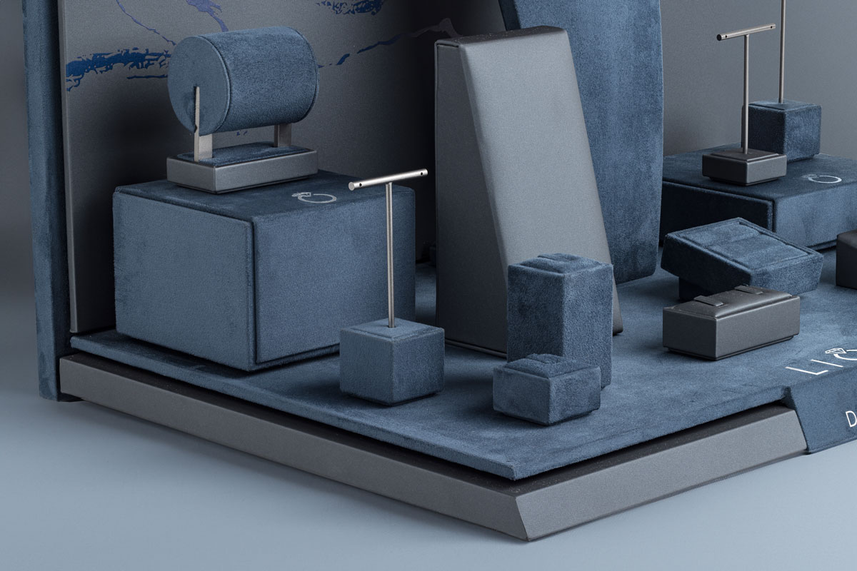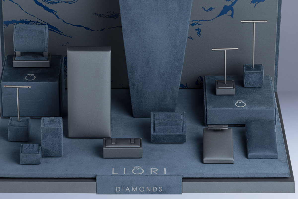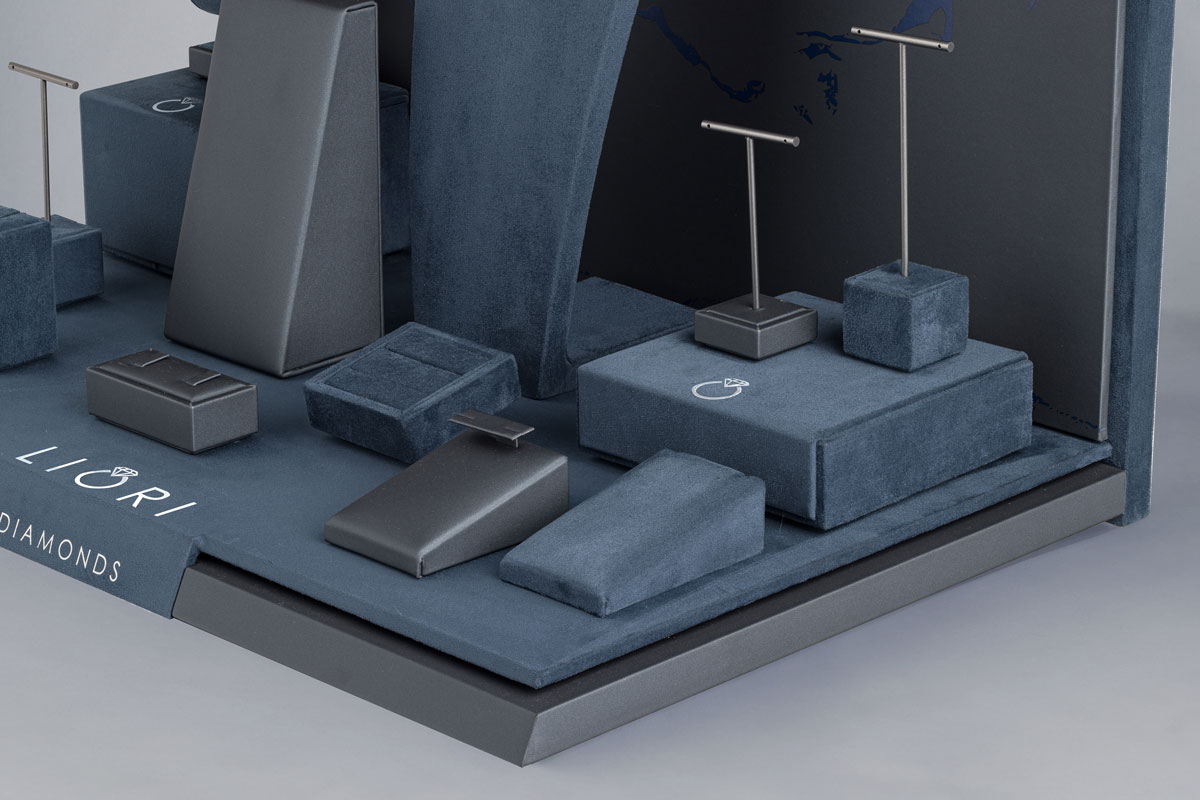 The jewellery display for Liori Diamonds shows an ethereal elegance, suitable for holding the finest diamonds. A unique experience in a world of refined beauty, where the colour midnight blue dominates.