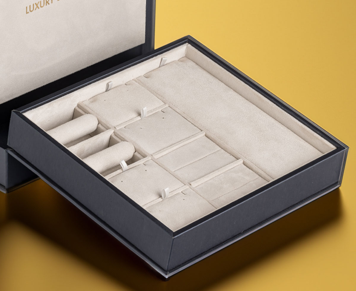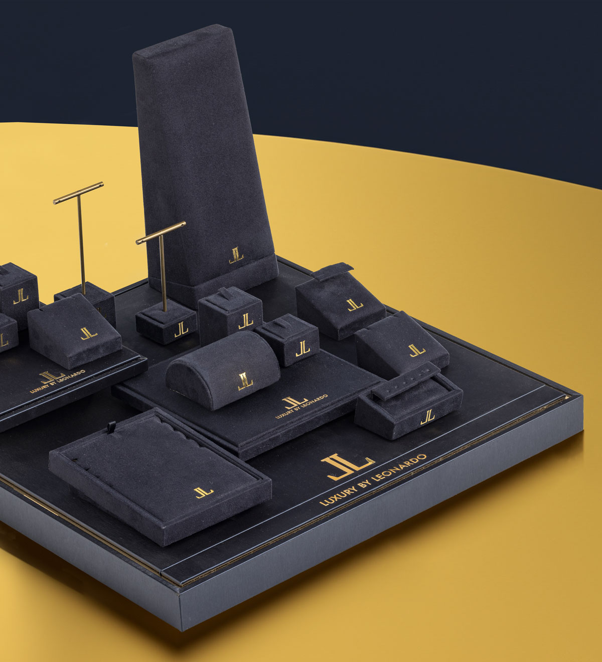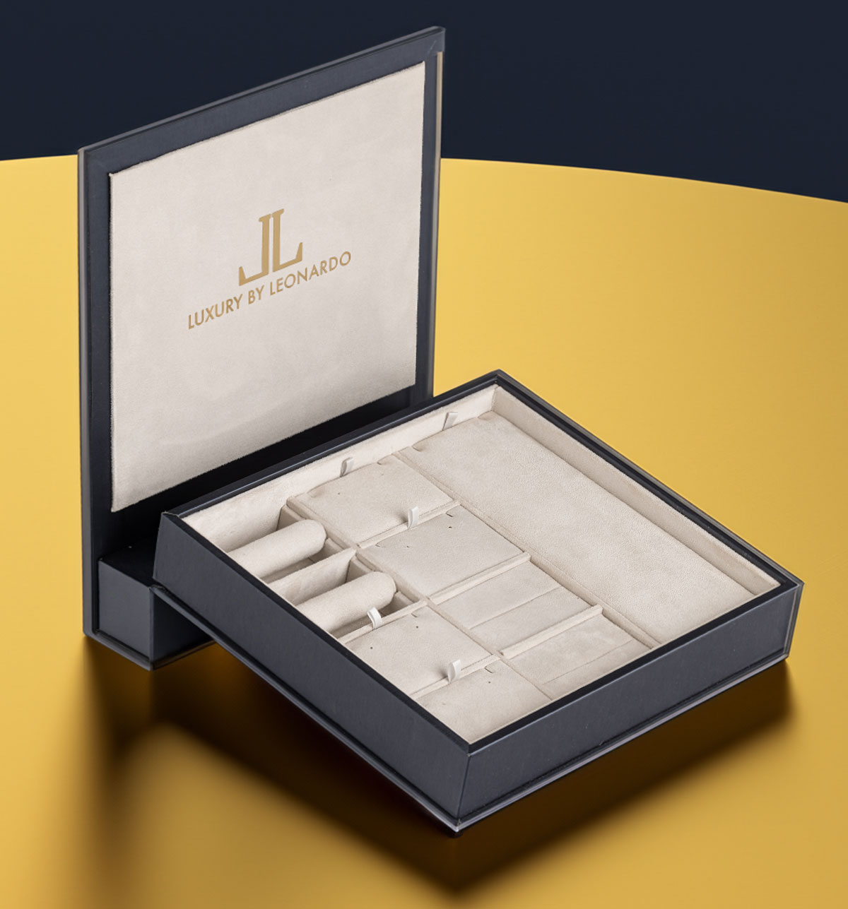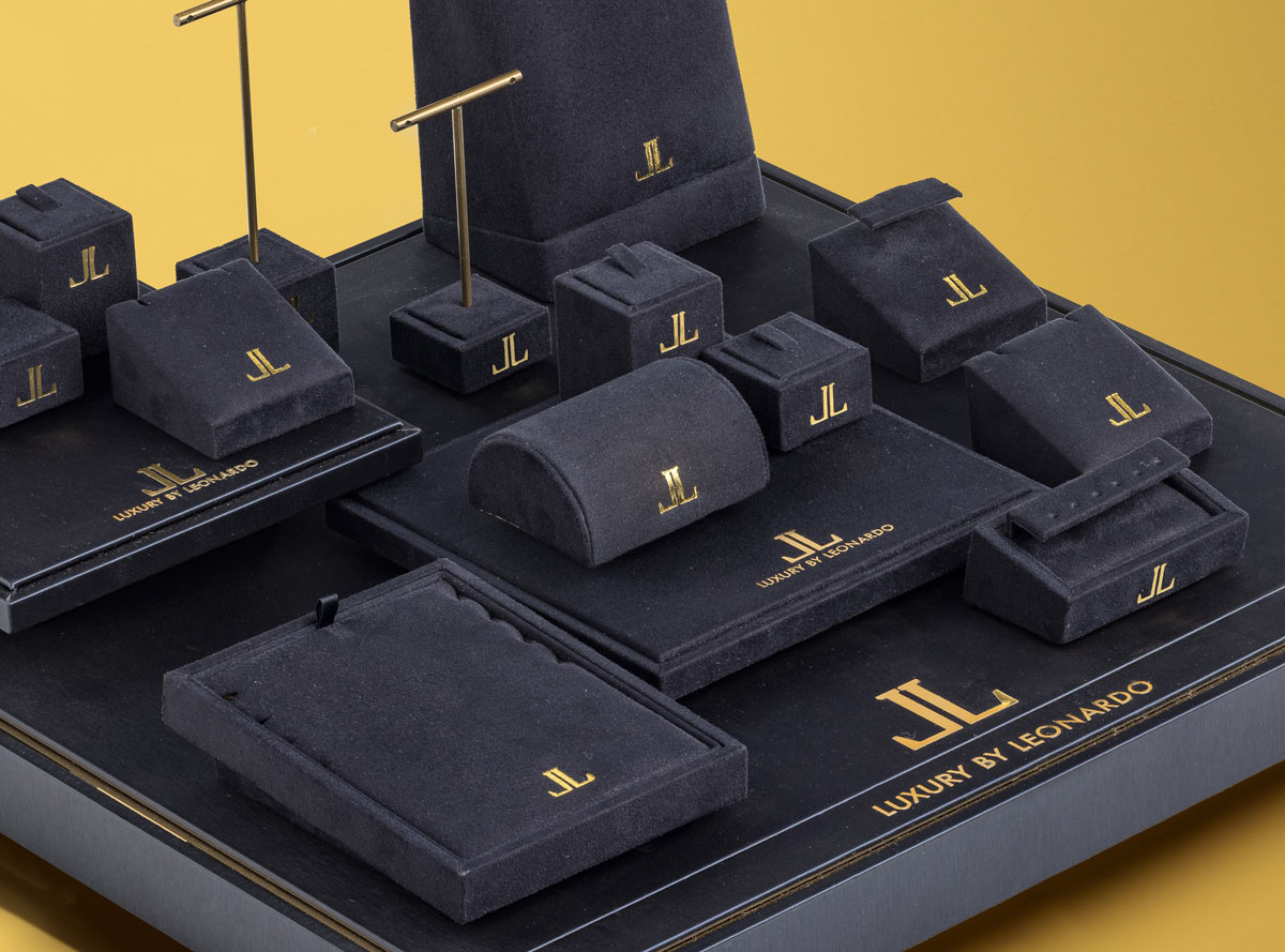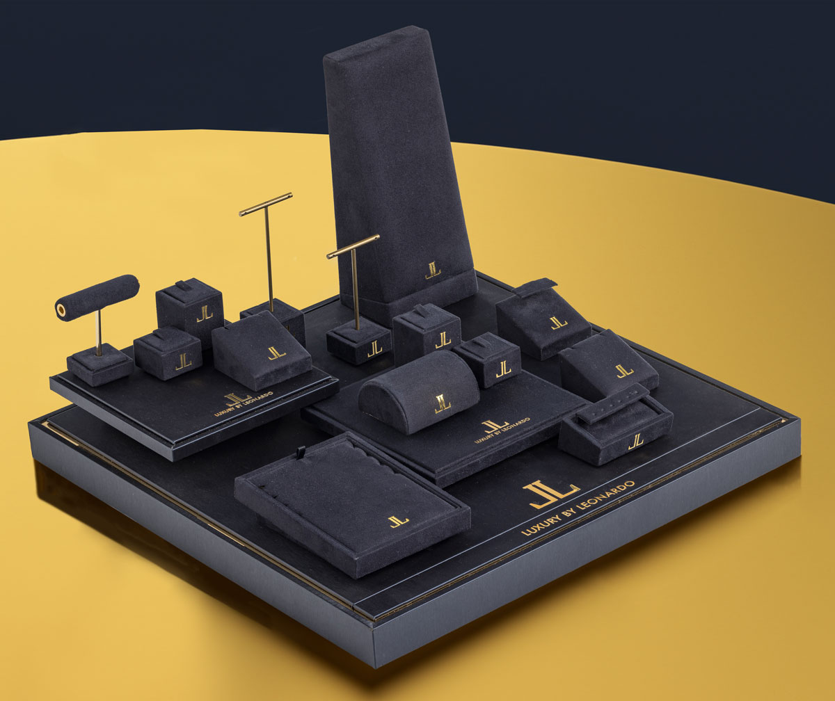 Wrapped in a fine midnight blue leatherette and soft velvet, the display and tray embody the essence of elegance. Gold details add a touch of luxury.